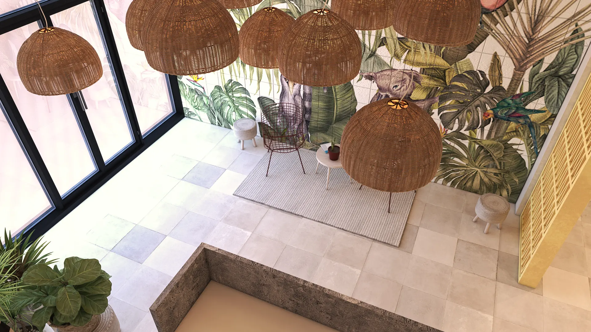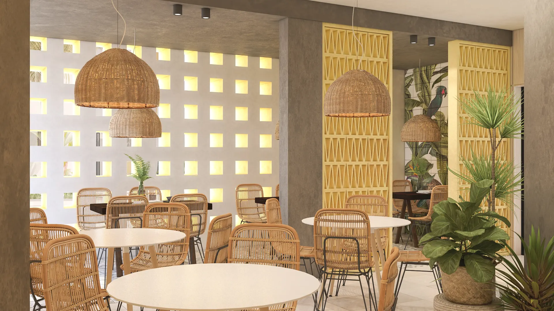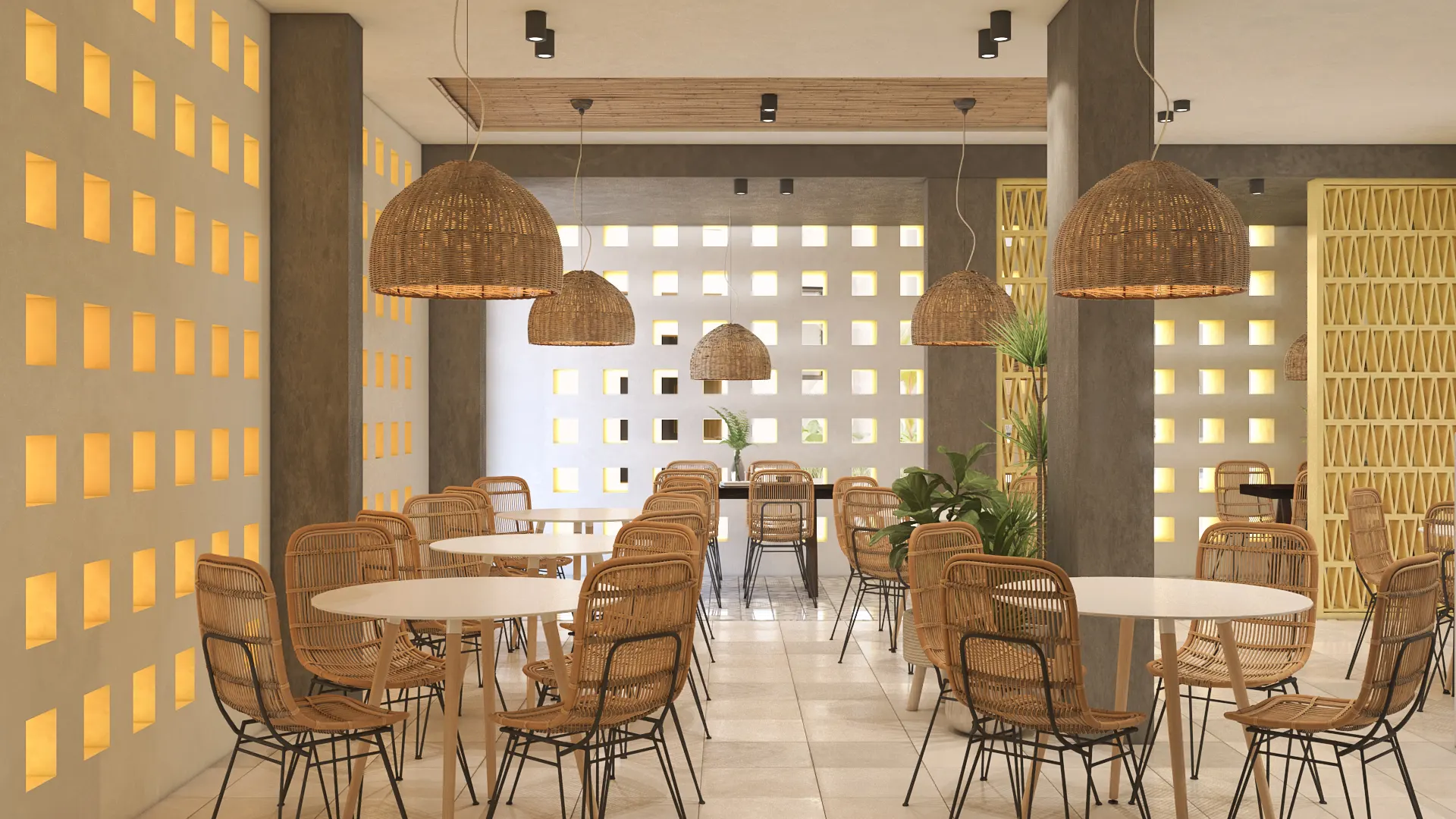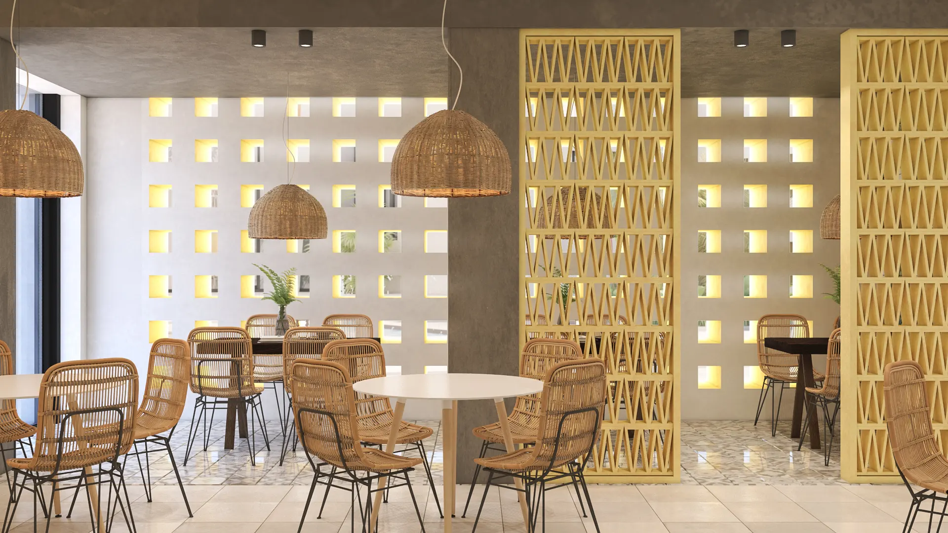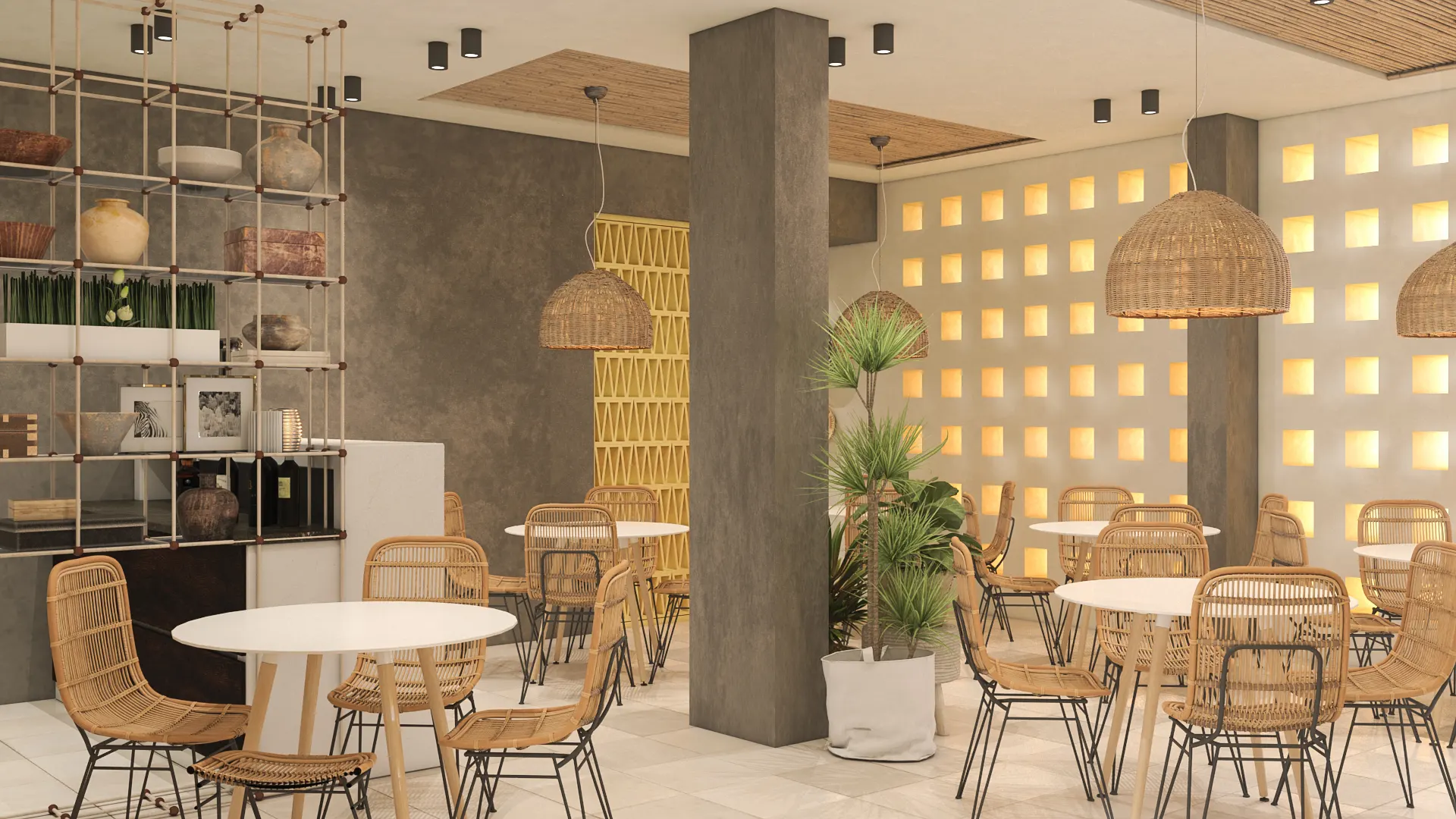 The interior design perfectly embodies the American-style pizzeria aesthetic, featuring sleek grey shades, black lines, and rustic wood textures. Our meticulous approach extends to the outdoor seating area, which includes a focal point pergola and lush greenery that serves as a natural centerpiece.